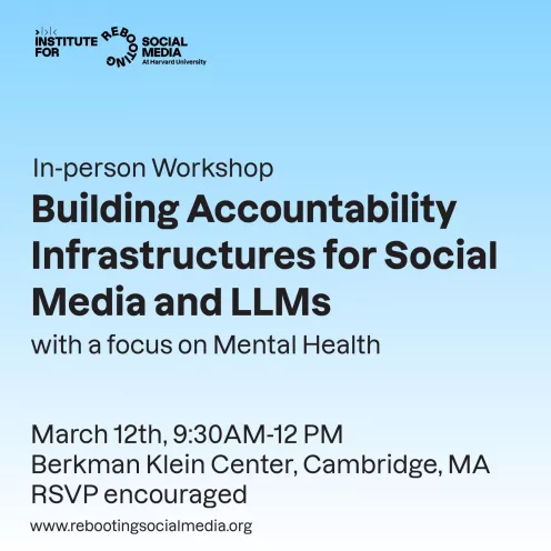 This in-person workshop, facilitated by ‘22-’23 Assembly Fellow Nathaniel Lubin and co-organized with Thomas Krendl Gilbert (AI and Society researcher, New York Academy of Sciences), will outline a public health framework for addressing societal-scale social media harms. Participants will have the opportunity to hear from leading experts in the tech and psychology fields, propose and operationalize specific problems, and discuss potential metrics for analysis. The convening will be designed to foster a growing community of practice around public approaches to mitigating harms caused by technology platforms.