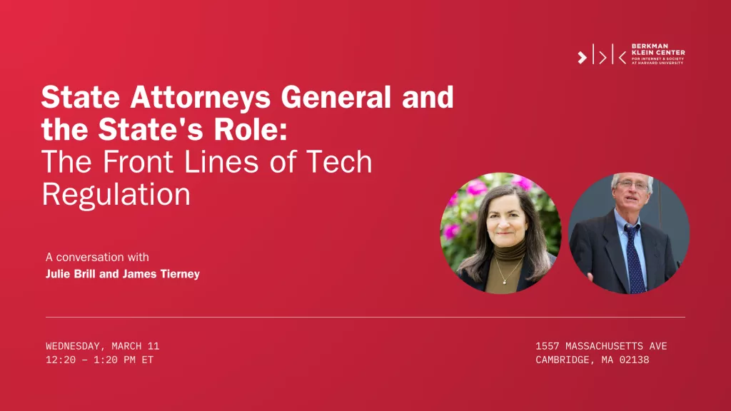 Join BKC for a lunchtime conversation with Julie Brill and Professor James Tierney on the evolving role of state attorneys general in technology enforcement and protecting the public. Drawing on their extensive experience in government and enforcement, the speakers will discuss how AG offices investigate and litigate cases, coordinate across states, and navigate challenges posed by artificial intelligence and emerging technologies.