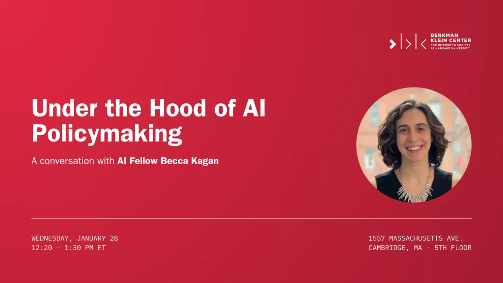 Rebecca Kagan (HLS '24) is a Senior Policy Advisor at the U.S. Department of Commerce's Office of Policy and Strategic Planning and an AI Fellow at the Berkman Klein Center. She will join us for a conversation on how AI policy gets made, who the key players are, and what it's like to work on these issues from inside government. This is a great opportunity for students thinking about careers in public service or tech policy.