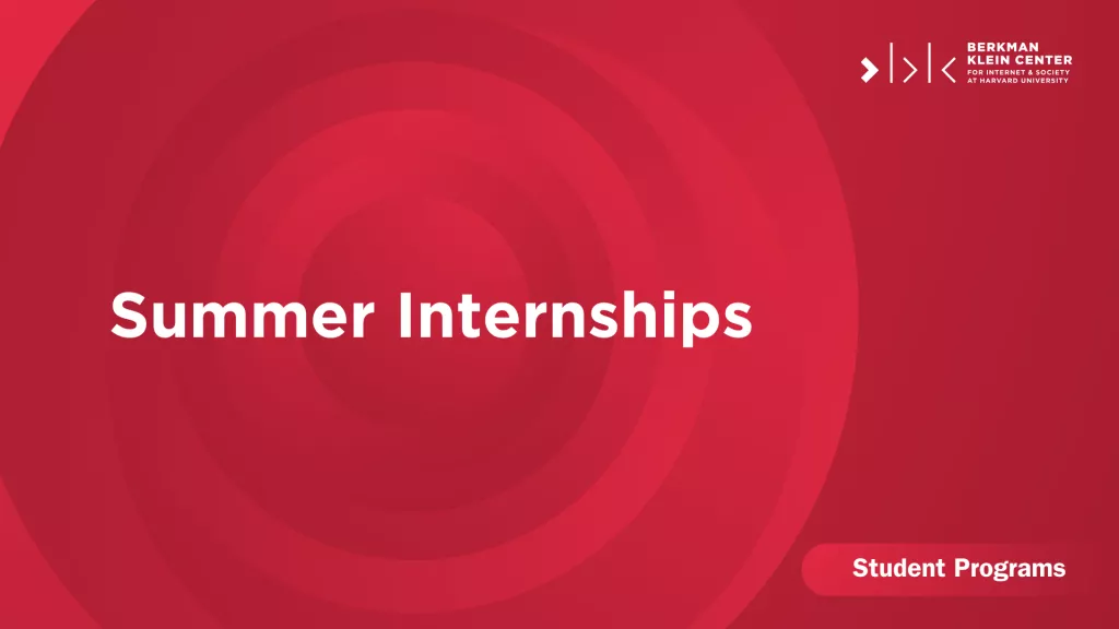 The Berkman Klein Center’s Summer Internship Program gives participants the opportunity to become deeply embedded within the projects and work happening across the Center. Interns spend the summer months working side-by-side with Berkman Klein staff, faculty, and scholars to keep projects moving forward, learning along the way. Interns will make valuable contributions over the course of the summer, to a wide range of projects based on the Center’s needs and the intern’s skills.