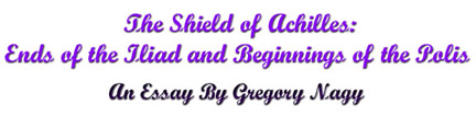 Homer critics have begun to interpret the resolution of the Iliad in Book 24, at the end of the epic, as a reflection of a new spirit that emerges from the heroic tradition and culminates in the ethos of the City State or polis.(1) A sign of this ethos is the moment when Achilles, following his mother's instructions to accept the apoina or 'compensation' offered by Priam for the killing of Patroklos by Hektor (Iliad 24.137), is finally moved to accept the apoina (24.502) and consequently to release the corpse of Hektor for a proper funeral, thereby making possible his own heroic rehumanization.(2) I propose that the ethos leading toward a resolution at the end of the Iliad is already at work inside the very structure of the Iliad. Though the rules of Homeric poetry seem incompatible with overt references to the values of the polis, the poetry itself draws attention to this incompatibility in the timeless and even limitless picture of the City at War and the City at Peace, depicted in the hero's own microcosm, the Shield of Achilles in Iliad 18.(3)