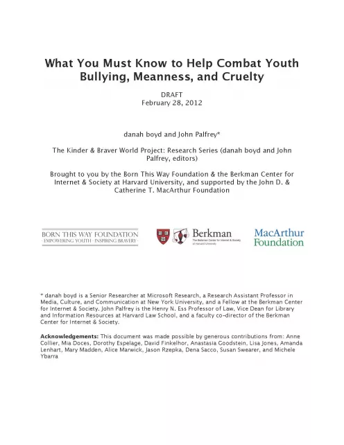In order to empower youth to create a kinder and braver world, we must begin by making sure that youth are safe. Youth are not safe when they are being bullied, harassed, or threatened. Thus, one of the first things that we must do to help youth be safe is combat the culture of meanness and cruelty that is at the root of bullying, peer violence, and abuse. Bullying is a systems problem and many well-intended people don’t realize the complexity of the issue. This document contains research-driven elements of bullying that should ground any discussion of how to address this complex issue.